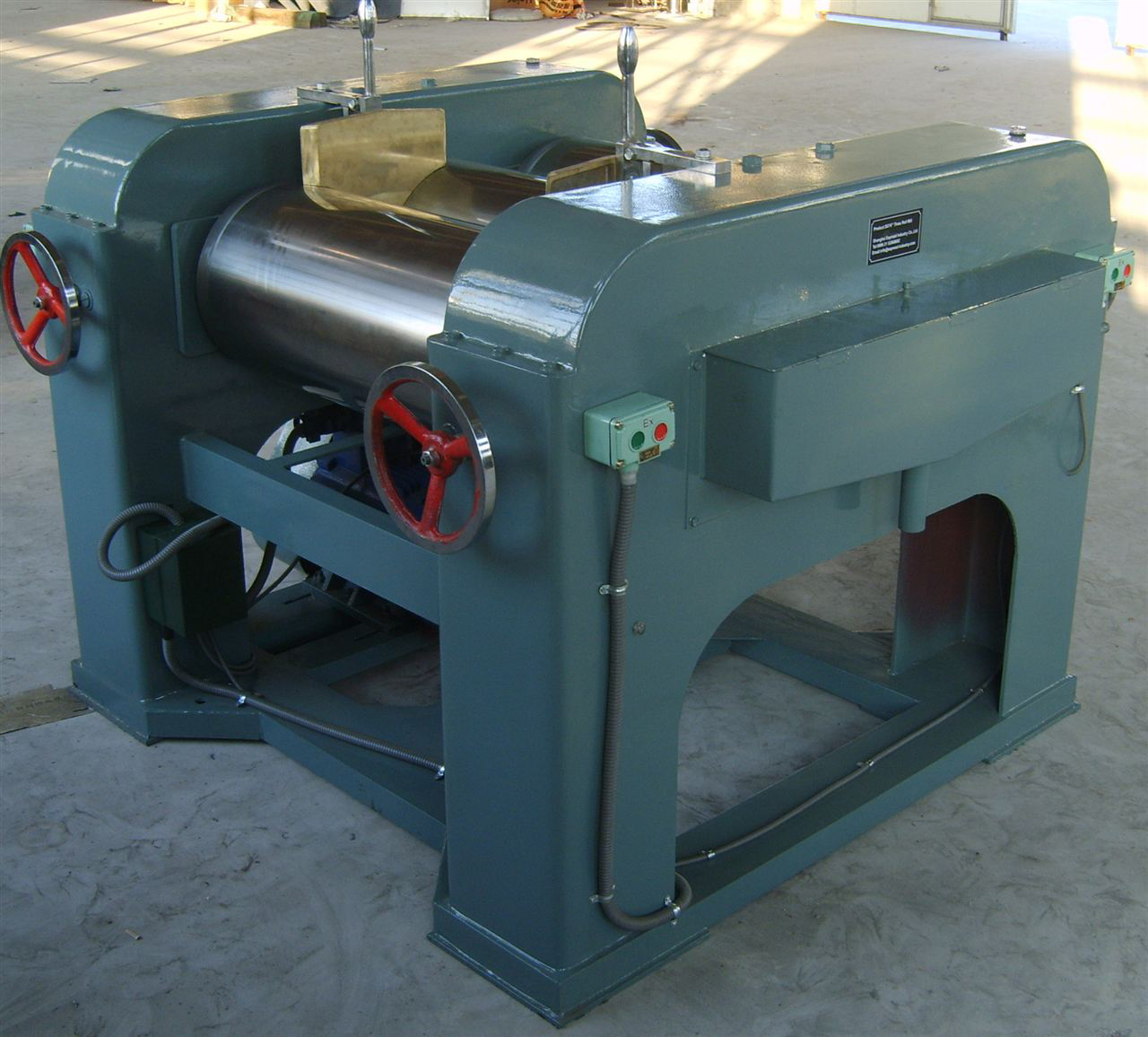 通過水平的三根輥筒的表面相互擠壓及不同速度的摩擦而達(dá)到研磨效果。三輥研磨機(jī)的輥筒材質(zhì)為冷硬合金鑄鐵離心鑄造而成。